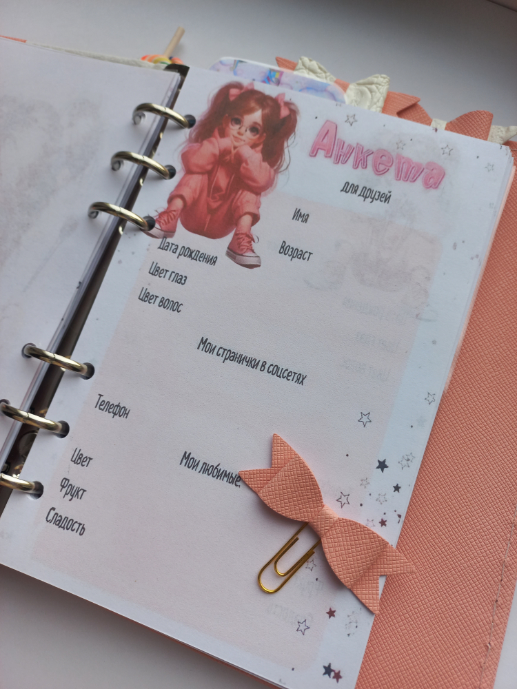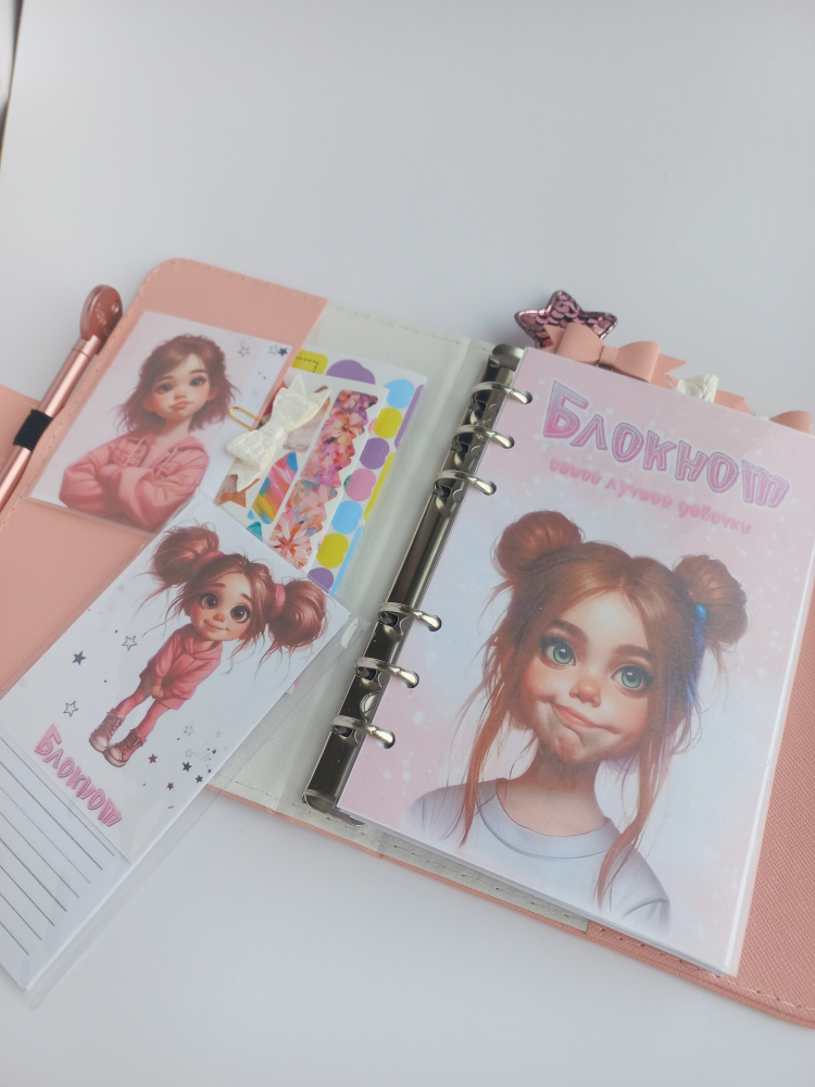 Размер 13,5×19 см. Блок страниц для записи (200 стр), кольцевой механизм, наклейки, скрепки-бантики, картинки. Упаковывается в красивую коробку.