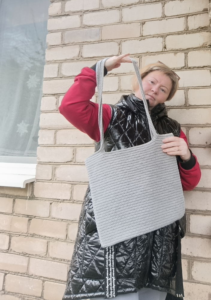 Сумка связана из акриловых ниток,светло серого цвета. Размер:35 см ширина 31 см высота.
