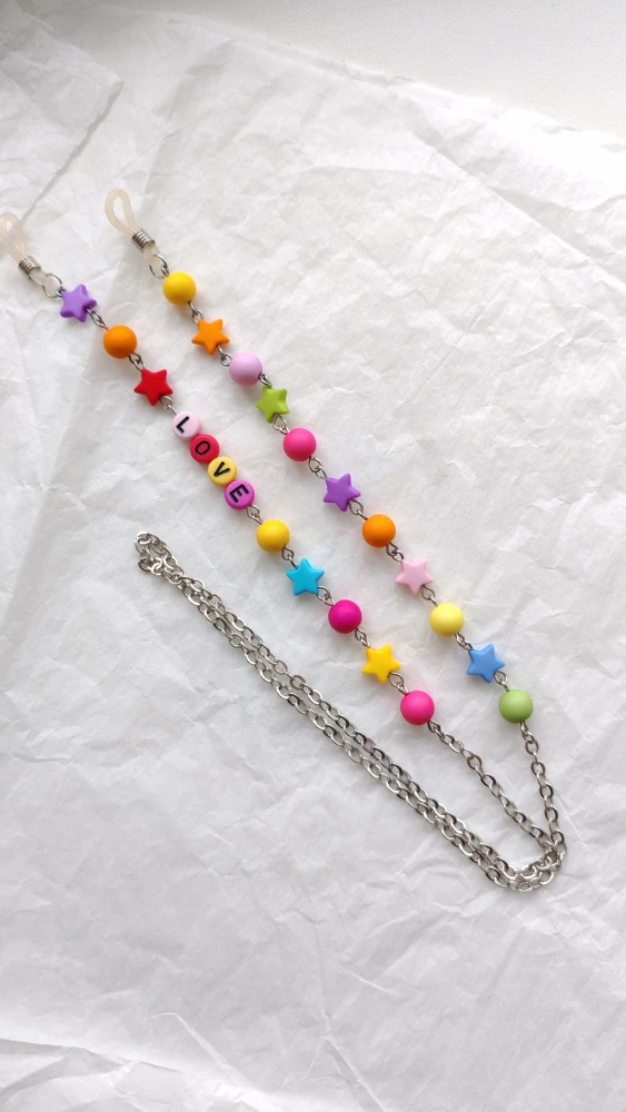 Цепочка из пластиковых бусин и цепочки из бижутерного сплава. Длина стандартная и очень комфортная в использовании.