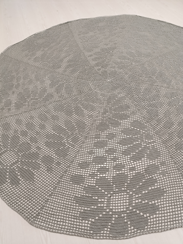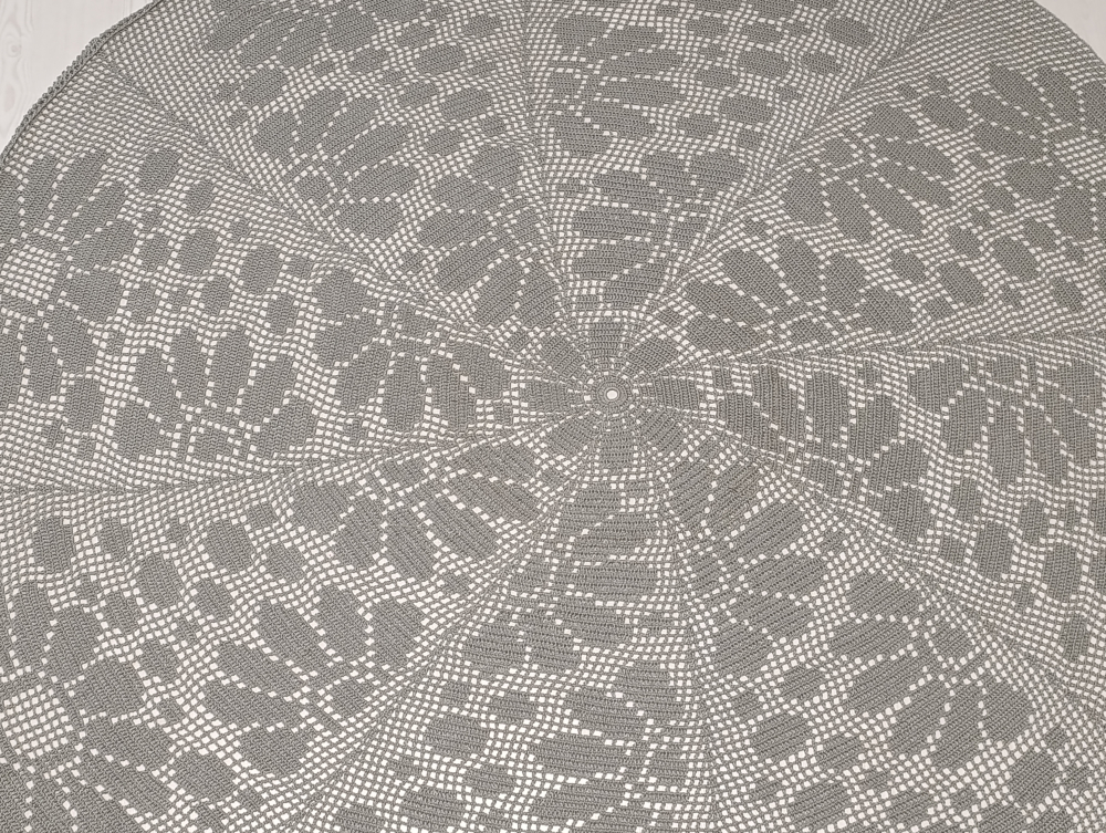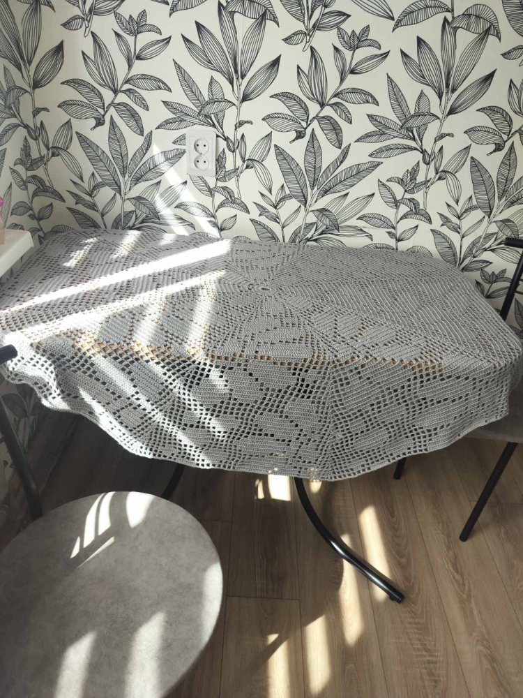 Скатерть связана из акриловых ниток светло серого цвета. Скатерть на круглый стол,размер ее 230 см. Так же можно постелить скатерть на квадратный или овальный стол.