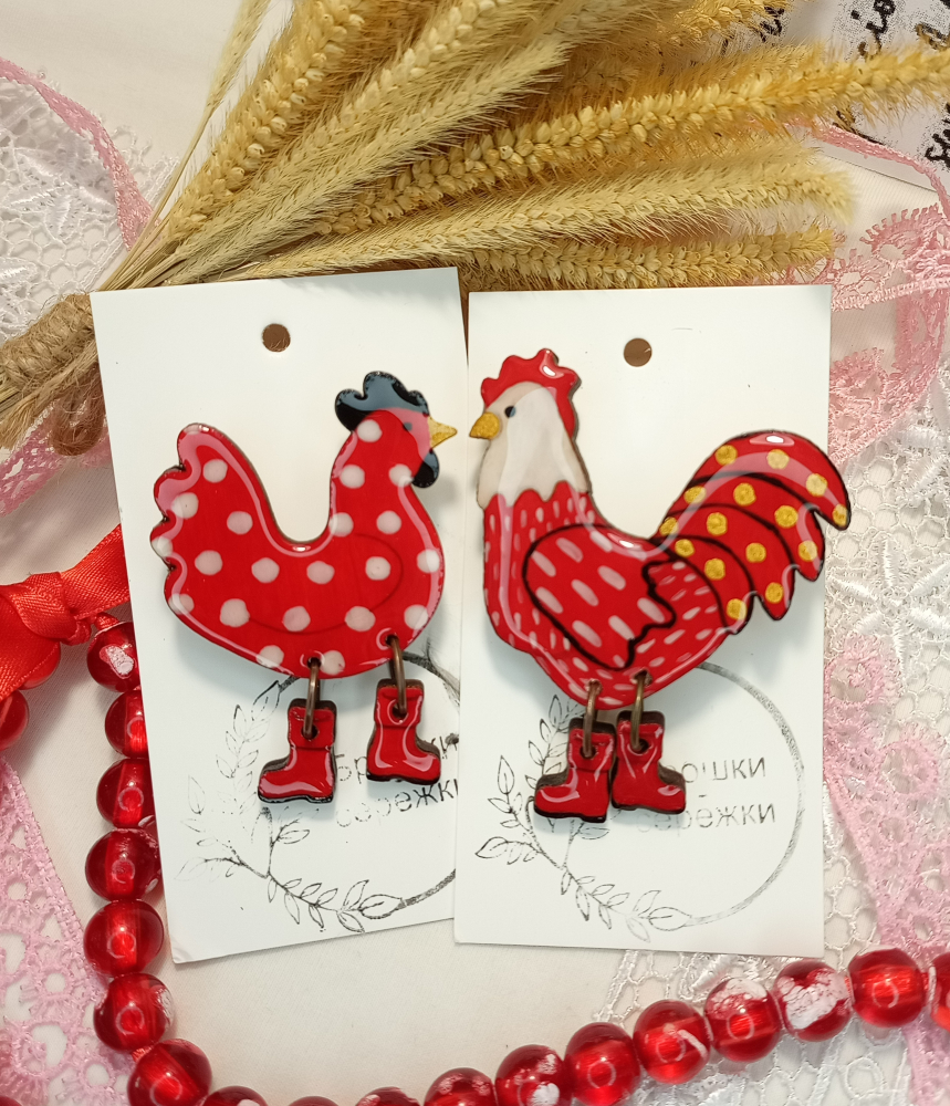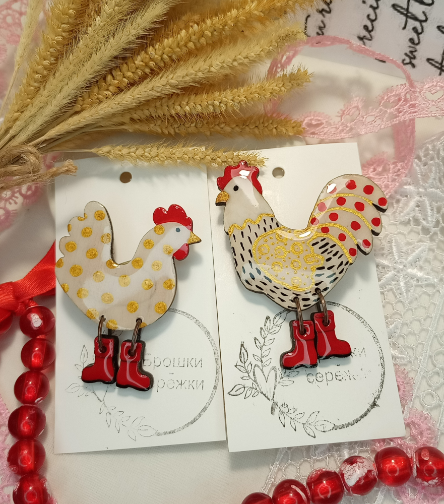 Брошки в сапожках (курочка, петушок) изготовлены из дерева, расписаны акриловыми красками и покрыты эпоксидной смолой вручную.
